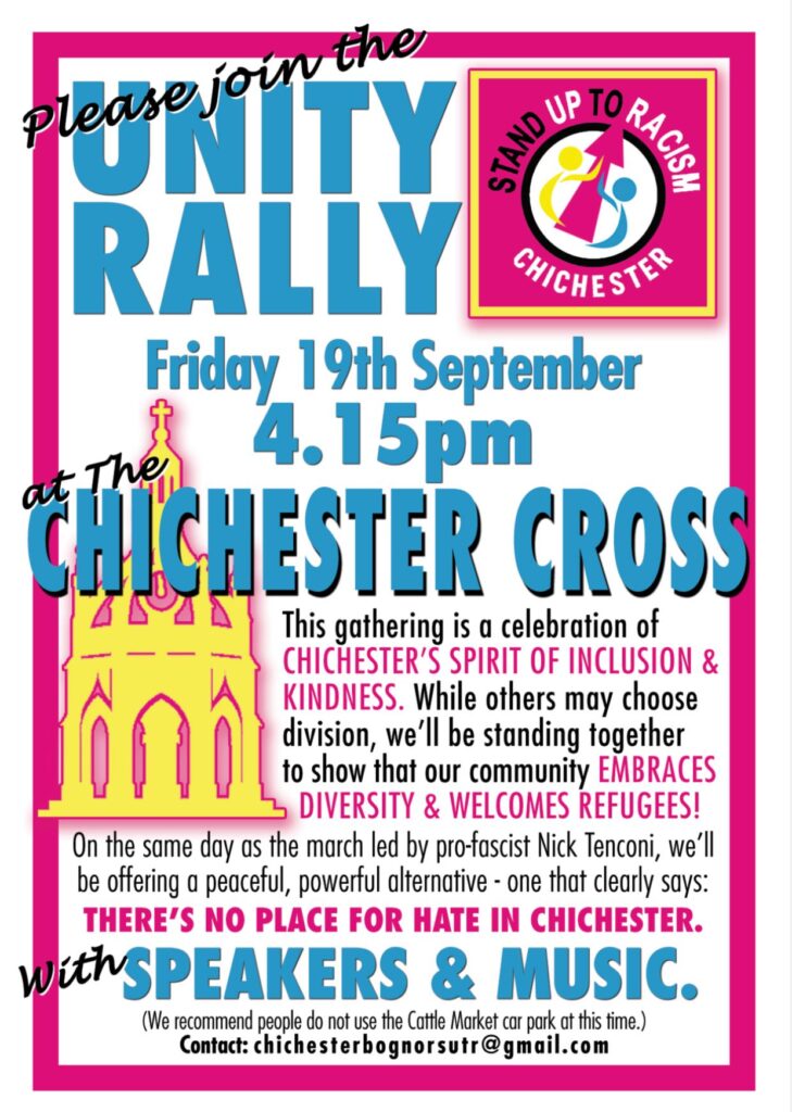 In response, Stand Up To Racism and local community groups are organising a Unity Rally at Chichester Cross, 4:15 p.m.. This gathering will be a celebration of Chichester’s spirit of inclusion and kindness. While others choose division, the Unity Rally will show that the local community embraces diversity and welcomes refugees.